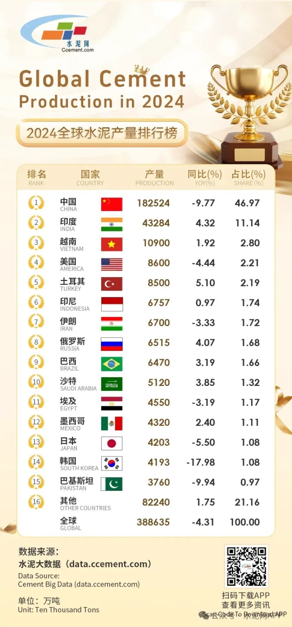 根据榜单显示,2024年全球水泥产量38.86亿吨,同比下降4.31%;中国以18.25亿吨的水泥产量,自1985年以来,连续39年位居第一。